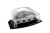 Monster PowerSplit enables high-current power transfer to multiple amplifiers for maximum performance. Multiple amplifiers in your car will deliver intense sound that adds power and depth to your favorite music, movies, and video games. Getting high-current power from your battery all the way to your amplifiers requires advanced-performance power distribution. With a 4-gauge input and four 8-gauge outputs, the Monster Performance 300 Series PowerSplit Mini Distribution Block transfers high-current power to multiple amplifiers and easily grows with your system. Set-screw terminals provide secure power cable connections that won't vibrate loose, while an impact-resistant patented polycarbonate protective cover and polished black nickel finish offer maximum protection, durability and a clean, high-profile installation..../ Monster 300 Series PowerSplit Mini Distribution Block 4 AWG into Four 8 AWG Split (MPC P300 PSM2-4) / part of automobile